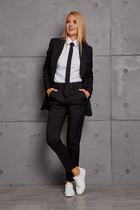 Комплект женский 2-х предметный состоящий из жакета и юбки выполненного из замшевой ткани. Жакет прямого с накладными карманами с клапаном. Спинка со средним швом. Рубашечный воротник. Спущена линия плеча. Рукав втачной одношовный по низу пата  с 2-мя  пуговицами. Застежка центральная на 5 пуговицы и петли. Жакет без подкладки.Юбка  А-силуэта  на обтачке. Застежка сзади  на потайную тесьму-молнию. Юбка на подкладке.