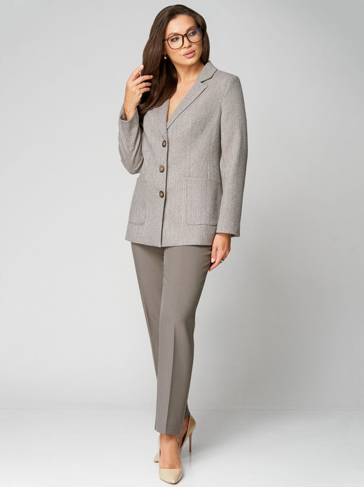 Комплект женский , двухпредметный жакет и брюки. Жакет на подкладке классического стиля. Воротник отложной с лацканами. По переду настрочены накладные карманы. Застежка однобортная на 3 пуговицы и петли. Длина жакета по спинке - 70 см. Спинка со средним швом и двумя шлицами. По шлицам пришиты пот3 декоративные пуговицы.  Рукав втачной, двухшовный. Длина рукава –  60 см. Брюки прямые, заужены к низу. Длина брюк по боковому шву без пояса - 102см. Брюки на поясе, по бокам резинка и косые карманы