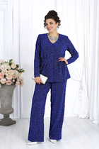 Комплект, состоящий из жакета и юбки. Жакет полуприлегающего силуэта выполнен из трикотажного полотна . По переду жакета настрочены карманы обманки с листочкой с декоративной тесьмой и пуговицей. Так же декоративная тесьма по горловине переда. Рукав втачной двухшовный. Спинка со средним швом и талиевыми вытачками. Застегивается жакет на 4 пуговицы и петли. Жакет без подкладки.  Длина рукава-  20,5 см, длина  по спинке-53 см.Юбка на  широкой обтачке А- силуэта, на подкладке из плащевой ткани. По переднему и заднему полотнищу заложены складки. По бокам расположены наклонные карманы. Застежка сзади на потайную тесьму-молнию.  Длина юбки по боковому шву- 83см.