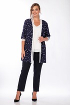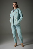 Костюм женский, состоит из блузы и брюк. Блуза прямого силуэта. Застежка центральная на 2 петли-пуговицы. воротник пиджачного типа. Блуза без карманов. Рукав внизу на пате, в боковых швах блузы - разрезы. Брюки прямые на резинке со шнурком, свободные, прямые, с боковыми карманами. Дополняет костюм съемный пояс.