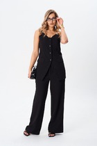 Костюм женский, состоящий из жакета на трикотажной подкладки и брюк палаццо. Жакет с притачной планкой по борту, с центральной застежкой на петли-пуговицы. Плечо спущенное, рукав втачной, с манжетой. Полочки и рукава из отделочной ткани. Брюки палаццо, на притачном поясе с резинкой и тесьмой. У брюк - боковые карманы.