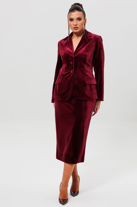 Бордовый костюм (жакет, кружевные манжеты и юбка-карандаш) станет основой вашего делового гардероба. Комплект из полуприлегающего жакета и классической юбки выполнен из качественного бархата, что добавляет образу статусности и стиля. Жакет на подкладке с отложным воротником и декоративными пуговицами легко комбинируется с другими вещами, а юбка-карандаш идеально подчеркивает фигуру, оставаясь комфортной для носки в течение всего дня. Данный костюм бордового цвета — прекрасный выбор для работы, деловых встреч, конференций или любого события, где важны безупречный вкус и элегантность. Дополняют модель кружевные манжеты, которые фиксируются по руке на резинку