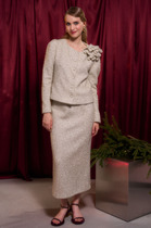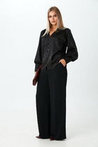 Костюм женский свободного силуэта состоит из блузы и брюк. Блуза, комбинированная из двух различных по фактуре тканей. По горловине застежка на крючек. Боковые швы заканчиваются небольшими разрезами. Воротник стойка. Рукава реглан, низ на резинке. Брюки палаццо, на притачном поясе с резинкой и тесьмой. У брюк - боковые карманы.