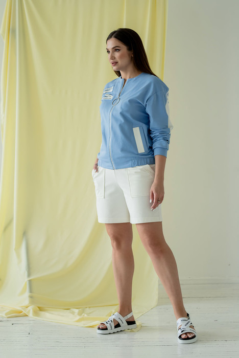 Комплект женский состоит из джемпера и шорт, свободного силуэта, выполнен из трикотажного полотна. Джемпер со спущенными плечами. По переду застёжка металлическая молния, прорезные карманы с листочкой и декоративная аппликация. По спинке подрез, переходящий на рукава контрастного цвета с декоративной печатью. Низ джемпера на резинке. Рукава двух шовные втачные на манжете.