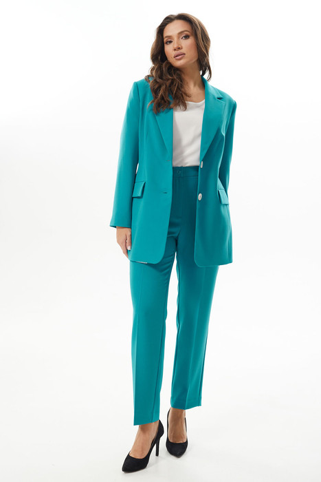 Комплект женский состоит из жакета, брюк и топа. Жакет полуприлегающего силуэта удлинённый, с центральной застёжкой на две прорезные петли и пуговицы.  Перёд жакета с талевыми вытачками и прорезными карманами и клапанами. Лацканы классической формы. Спинка со средним швом. Перед и спинка с рельефами от проймы до низа изделия. Рукава втачные двух шовные. Жакет на подкладке. Брюки женские с высокой посадкой, зауженные к низу, на притачном поясе, по спинке вытачки. По переду застёжка молния с гульфиком и откоском, вытачки, карманы. Пояс застёгивается на прорезную петлю и пуговицу. Топ свободного силуэта без рукава. По переду нагрудные вытачки, спинка с центральным швом. Горловина круглая