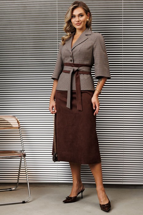 Бестселлер нашей коллекции - двухпредметный костюм, состоящий из жакета и юбки. Акцентом данного комплекта является съемный пояс. Для создания данного образа мы использовали мелкую клетку в тандеме с экокожей.Жакет прилегающего силуэта с отрезной баской по переду и спинка с рельефами. Рукав-реглан.Юбка А-силуэта на притачном поясе, сзади с резинкой. Застежка на тесьму-молнию в боковом шве.Костюм на подкладке.