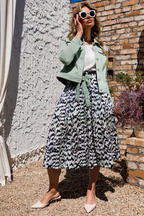 Комплект женский, состоящий из двух предметов : куртки в джинсовом стиле и юбки. Куртка полуприлегающего силуэта. Полочка с отрезной кокеткой, рельефными швами от кокетки до низа куртки. Спинка с отрезной кокеткой и рельефными швами. По низу куртки идет притачная планка, которая на боковых швах украшена настрочными патами. Рукав втачной, двухшовный. Воротник притачной. Застежка центральная на металлические пробивные пуговицы. Подборт нижней планки, нижний манжет выполнен из однотонного отделочного материала. Рельефы кокетки, клапаны и воротник отстрочены двойной отделочной строчкой. Юбка силуэта "колокол" с завышенной линией талии. По верхнему краю юбки, который обработан подкройной обтачкой, заложены встречные складки. В боковых швах юбки - карманы. На уровне складок по линии талии настрочены шлевки. Декором юбки является объемный пояс, который украшен металлическими деталями.