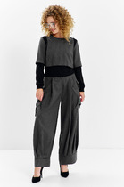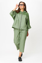 Женский трендовый костюм, состоящий из жакета и брюк. Жакет полуприлегающего силуэта, удлиненный, со смещенной бортовой застежкой на завязку и потайную пуговицу. По переду талиевые вытачки, выходящие от горизонтальных подрезов, в которых обработаны карманы в рамку с клапанами. На груди обработана листочка, имитирующая нагрудной карман. Спинка со средним швом и талиевыми вытачками. Рукав втачной, двухшовный, со шлицей. На шлицах по две декоративных пуговиц. Воротник пиджачного типа. Жакет на подкладке. Брюки на притачном поясе с резинкой, прямые, со складкой по талии и с заутюженными кантами. По бокам обработаны карманы. Брюки с завышенной талией, свободной формы, выгодно подчеркивают изящность ног и придают fashion-нотку образу. Удобная в носке ткань, хорошая посадка по фигуре, универсальность и лаконичность модели не оставят равнодушной ни одну женщину