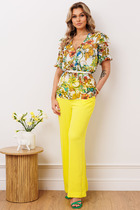 Комплект женский, состоящий из блузы, которая выполнена из шифона, и однотонных брюк. Блуза полуприлегающего силуэта, с баской, по линии талии на резинке. Рукав втачной, снизу на резинке, сверху по окату с воланами. Брюки прямые, сверху на притачном поясе, сзади с резинкой, по переду с карманами.