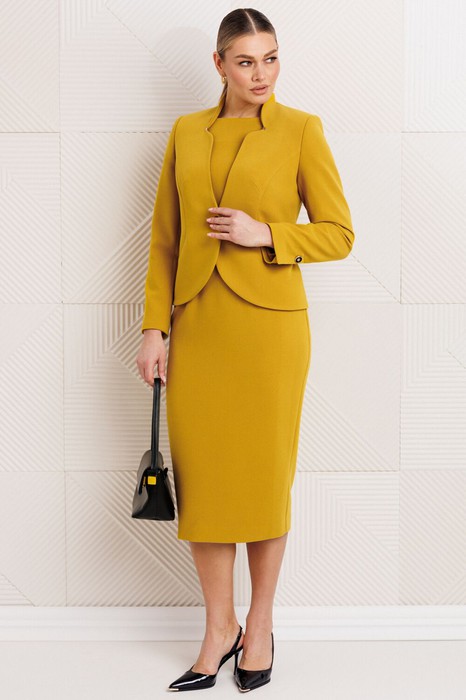 Изысканный двухпредметный костюм, состоящий из жакета полуприлегающего силуэта и женственного платья. Модель выполнена из мягкого костюмного полотна, которое дарит ощущение комфорта в течение всего дня.Жакет отличается продуманным кроем: фигурные рельефы, выходящие из пройм в боковые швы, моделируют силуэт. Центральная застежка на петлю и пуговицу дополнена закругленными бортами. Главный акцент — фантазийный вырез горловины с цельнокроеной стойкой по переду, элегантно зафиксированной стильными зажимами. Рукава — втачные, двухшовные, со шлицами на пуговицах. Жакет полностью на подкладке.Платье приталенного силуэта длиной ниже колена подчеркивает достоинства фигуры. Вырез «лодочкой» спереди и V-образный вырез на спинке открывают плечи. Короткие рукава-«крылышки» придают образу легкость. Для комфорта движений в среднем шве спинки предусмотрены шлица и потайная молния. Платье также посажено на подкладку.