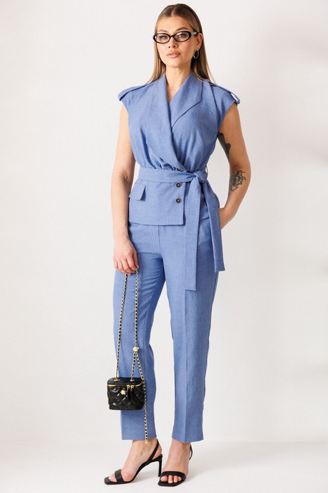 Летний брючный костюм, состоящий из жакета без рукавов со щелевидной проймой и брюк. Жакет свободной формы с удлиненной линией плеча и баской по низу. По линии притачивания баски по переду сборка для создания объема и нужной формы. По спинке средний шов и талиевые вытачки. Застежка смещенная на три пуговицы. Воротник стиля апаш. По линии плеча - погоны, закрепленные пуговицей. На баске клапан, по бокам - шлевки, куда входит завязывающийся пояс по линии талии. Жакет без подкладки. Брюки классические, зауженные к низу, чуть укороченные, с небольшими разрезами по низу. По линии талии пояс-кокетка  и карманы-хулиганы по бокам. В брюках заутюженные стрелки и застежка на молнию и пуговицы.
