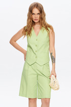 Топ прямого силуэта, на брителях. Вырез горловины V-образной формы по переду и спинке, в боковых швах разрезы.