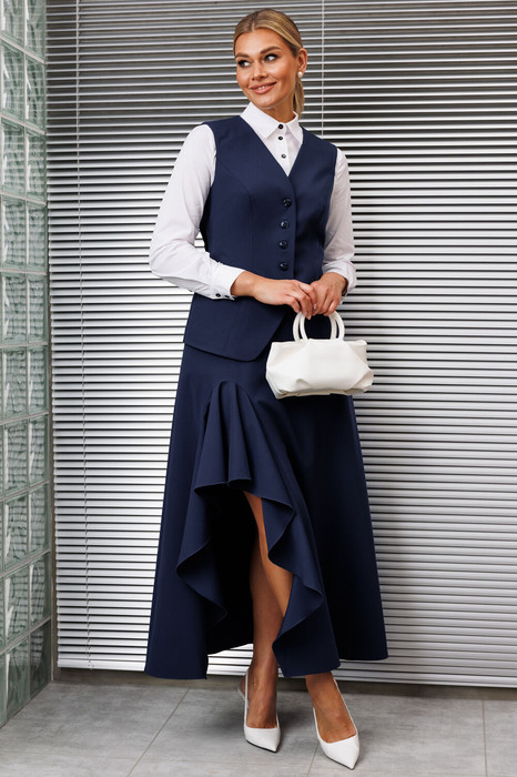 Комплект, состоящий из жилета и юбки. Жилет полуприлегающего силуэта, с рельефами по переду и спинке. На полочках обработаны карманы в рамку. Спинка со средним швом. Застежка центральная на петли-пуговицы. Юбка А-силуэта, с одной стороны с воланом, сверху юбка на притачном поясе, с резинкой по бокам. Застежка на тесьму-молнию в боковом шве. Жилет на подкладке.