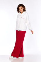 Брюки прямого, свободного кроя с высокой посадкой, с наклонными карманами в боковых швах, по срезу банта – застежка-молния. По передним половинкам талиевые вытачки. По низу брюк отрезные манжеты.