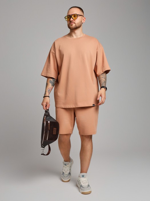 Костюм мужской из плотного гладкокрашеного трикотажного полотна "кулирка", состоящий из футболки и шорт. Футболка - свободного покроя, с удлиненными плечевым и швами, короткими втачными рукавами и горловиной овальной формы, обработанной втачной планкой. В нижней части переда слева настрочен декоративный элемент прямоугольной формы. По горловине проложена отделочная строчка. Шорты - классического покроя, на притачном поясе с эластичной тесьмой внутри и карманами в боковых швах. Для регулирования степени прилегания шорт по талии в пояс вставлен шнурок, продетый через две петли в центре пояса.