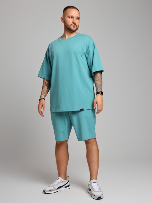 Костюм мужской из плотного гладкокрашеного трикотажного полотна "кулирка", состоящий из футболки и шорт. Футболка - свободного покроя, с удлиненными плечевым и швами, короткими втачными рукавами и горловиной овальной формы, обработанной втачной планкой. В нижней части переда слева настрочен декоративный элемент прямоугольной формы. По горловине проложена отделочная строчка. Шорты - классического покроя, на притачном поясе с эластичной тесьмой внутри и карманами в боковых швах. Для регулирования степени прилегания шорт по талии в пояс вставлен шнурок, продетый через две петли в центре пояса.