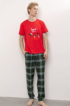 Костю мужской из трикотажного полотна "кулирка", состоящий из футболки и шорт. Футболка классического покроя, с короткими втачными рукавами и приспущенной линией плеч, горловиной овальной формы, обработанной втачной планкой и принтом на детали переда, выполненным в технике шелкографии. Нижние срезы рукавов и изделия обработаны подгибкой. По горловине настрочена отделочная строчка. Шорты длиной до колен, на притачном поясе с эластичной тесьмой внутри, с карманами в боковых швах. Нижние срезы обработаны подгибкой.