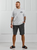 Костюм мужской, состоящий из футболки и шорт. Футболка однотонная с принтом на груди; модель свободная, со спущенной линией плеч, втачными рукавами, овальным вырезом горловины. Шорты из полотна с набивным рисунком эксклюзивного дизайна, с боковыми карманами с обтачными входами, на притачном поясе с отстроченной эластичной тесьмой.