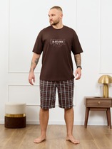 Костюм мужской, состоящий из футболки и шорт. Футболка однотонная с принтом на груди; модель свободная, со спущенной линией плеч. Шорты из полотна с набивным рисунком в узкую черно-белую полоску, с боковыми карманами с обтачными входами, на притачном поясе с отстроченной эластичной тесьмой.