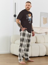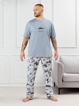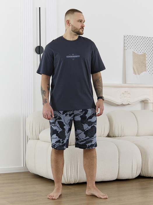 Костюм мужской, состоящий из футболки и шорт. Футболка однотонная с принтом на груди; модель свободная, со спущенной линией плеч, втачными рукавами, овальным вырезом горловины. Шорты из полотна с набивным рисунком эксклюзивного дизайна, с боковыми карманами с обтачными входами, на притачном поясе с отстроченной эластичной тесьмой.