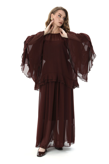 Костюм трехпредметный: состоит из блузы, юбки и комбинации. Блуза свободного силуэта с присборенной горловиной, обработанной бейкой. Спинка со средним швом, переходящим в разрез. Рукава реглан с асимметричными воланами. Юбка макси расширенного силуэта на резинке. Нижний край блузы с двойным воланом. Нижнее платье комбинация на регулируемых бретелях.