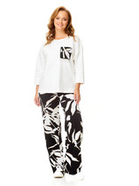 Костюм трёхпредметный: кардиган, футболка и брюки. Классический универсальный кардиган прямого силуэта, выполнен из плотной, уютной пряжи. Футболка свободного кроя из хлопковой кулирки. Рукав втачной, планка по горловине. Вырез круглый. Низ изделия и рукавов имеют плоский шов. Брюки полуприлегающего силуэта,зауженные к низу. По переду боковой карман, застежка на тесьму-молнию и пуговицу. Длина брюк 99 см.