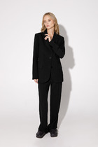 Костюм двухпредметный: состоит из джемпера и брюк. Джемпер свободного силуэта с округлой горловиной. Рукав комбинированного кроя, с передними и задними швами. Верхняя и нижняя часть рукава образуют между собой разрез. Карманы в боковых швах. По переду изделие декорировано фигурным бантом. Брюки со стрелкой свободного кроя, верхний срез представлен широкой резинкой, с карманами.