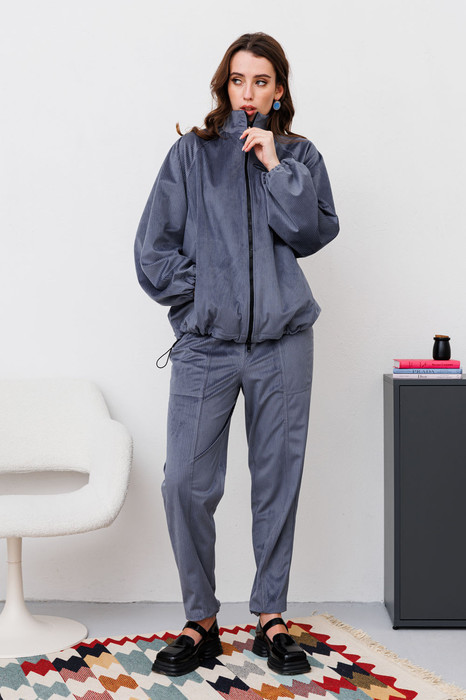 Костюм двухпредметный: состоит из джемпера и брюк. Джемпер объема оверсайз  прямого силуэта. По полочке и спинке вертикальные рельефы. Рукав длинный, широкий, покроя реглан. Воротник-стойка. Застежка центральная на молнию. По низу изделия протянут эластичный шнур с фиксатором. Брюки средней посадки заужены к низу. Пояс притачной на резинке. В петли на поясе вставлен шнур. Передние половинки брюк с вертикальными швами. В боковых швах выполнены наклонные карманы.