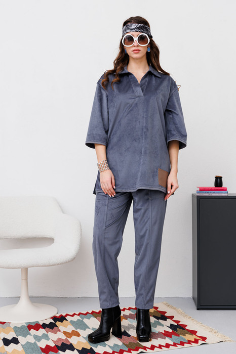 Костюм двухпредметный: состоит из блузы и брюк. Блуза прямого силуэта свободного кроя с втачным рукавом со спущенной проймой. По горловине переда планка с запахом. Воротник с цельнокроенной стойкой. По низу переда имеется нашивка из экокожи. Боковые швы с разрезами. Брюки средней посадки заужены к низу. Пояс притачной на резинке. В петли на поясе вставлен шнур. Передние половинки брюк с вертикальными швами. В боковых швах выполнены наклонные карманы.
