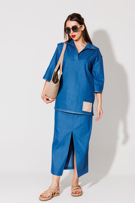 Костюм двухпредметный: состоит из блузы и юбки. Блуза прямого силуэта свободного кроя с втачным рукавом со спущенной проймой. По горловине переда планка с запахом. Воротник с цельнокроенной стойкой. По низу переда имеется нашивка из экокожи. Боковые швы с разрезами. Юбка длиной миди прямая на резинке. Разрез по переду. Изделие без подкладки.