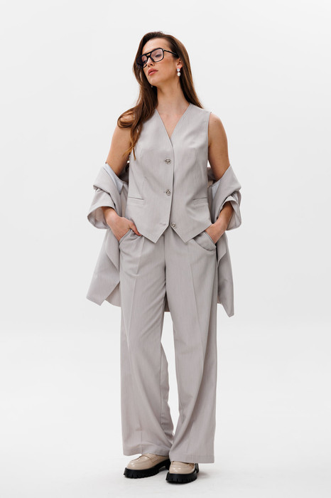 Костюм двухпредметный: состоит из жилета и брюк. Жилет полуприлегающего силуэта на подкладке. По переду вытачка, переходящая в подрез, функциональный карман. Застежка на петли-пуговицы. По спинке вытачки и хлястик. Брюки свободного кроя, верхний срез представлен широкой резинкой, с карманами.