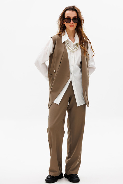 Костюм двухпредметный: состоит из жилета и брюк. Жилет двубортный прямого кроя объёма оверсайз. Застёжка фигурная на петли и пуговицы. Карманы - листочки. Брюки прямого силуэта с вытачками по задней половинке. Наклонные карманы в боковых швах по передней половинке изделия. Застёжка на тесьму-молнию с резинкой по поясу. Отделочная деталь пояса на резинке из рубашечной ткани создаёт имитацию двойного пояса.