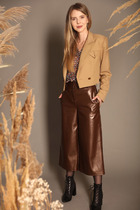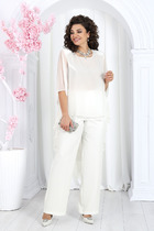 Костюм двухпредметный: состоит из рубашки и юбки. Рубашка прямого кроя со спущенной линией плеча. Горловина обработана рубашечным воротником с отрезной стойкой. Застёжка центральная на кнопки. Есть нагрудные карманы и в боковых швах. Низ рукава обработан притачной манжетой, застёгивается на кнопки. Фигурный низ. Изделие без подкладки. Элегантная юбка прямого силуэта длиной миди с разрезами на переднем и заднем полотнищах. Переднее полотнище с частичным запахом, имитацией боковых карманов с отрезным бочком. Заднее полотнище со средним швом, отрезной кокеткой, накладными карманами. Пояс притачной.