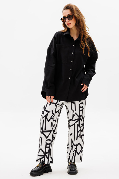 Костюм двухпредметный: состоит из рубашки и брюк. Рубашка прямого кроя объёма оверсайз со спущенной линией плеча с асимметричным бочком. Горловина обработана рубашечным воротником с отрезной стойкой. Застёжка центральная на петли и пуговицы. Есть нагрудный карман. Низ рукава обработан притачной манжетой, застёгивается на пуговицы. Брюки средней посадки, свободные вверху, слегка зауженные к низу с наклонными боковыми карманами.  Низ брючины ассиметричный, декорирован пуговицами. Пояс широкий отрезной, сзади на эластичной тесьме-резинке, по переду застежка на петли-пуговицы.