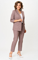 Костюм двухпредметный: состоит из жакета и брюк. Жакет рубашечного типа прямого силуэта с асимметричным низом. Рукав втачной со спущенной линией плеча, фиксируется на пату. Застежка центральная на петли и пуговицы, смещённая по косой. На левой полочке накладной карман с клапаном. Воротник отложной на стойке до половины спинки. Брюки свободного кроя из гладкой ткани сочетают элегантность и комфорт. Широкая резинка на поясе и наличие функциональных карманов подчеркивают удобство модели.