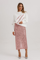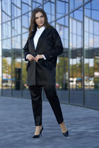 Костюм двухпредметный: состоит из блузы и брюк. Блуза свободного прямого кроя из комбинированной ткани. Воротник стояче-отложной рубашечного типа, застёжка центральная на петли и пуговицы. Рукав втачной одношовный с притачной манжетой на петлю и пуговицу. Спинка с отрезной кокеткой, нижняя часть спинки декорирована трикотажным гофре. Низ изделия по переду ассиметричный. Брюки свободного кроя, верхний срез представлен широкой резинкой, с карманами.