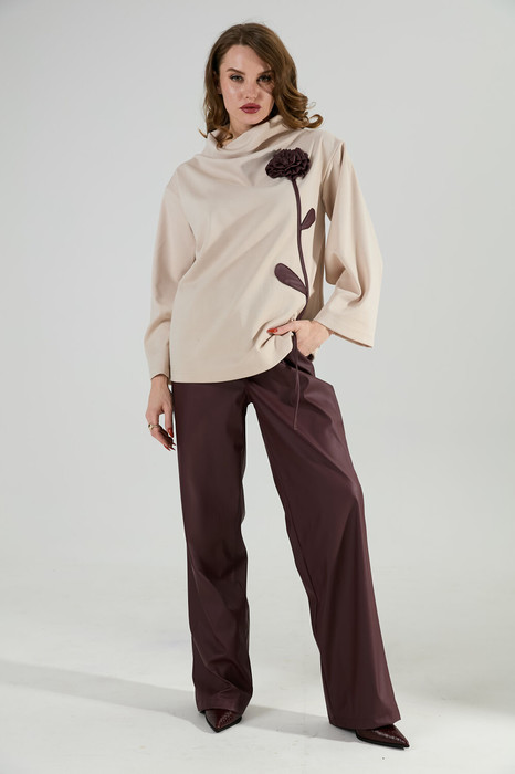 Костюм двухпредметный: состоит из джемпера и брюк. Джемпер-кейп прямого свободного силуэта. Горловина с цельнокроеным воротником-стойкой. Рукав втачной широкий, от линии локтя до запястья есть дополнительное отверстие для рук. Декорирован цветком из контрастной ткани. Брюки свободного кроя, верхний срез представлен широкой резинкой, с карманами.