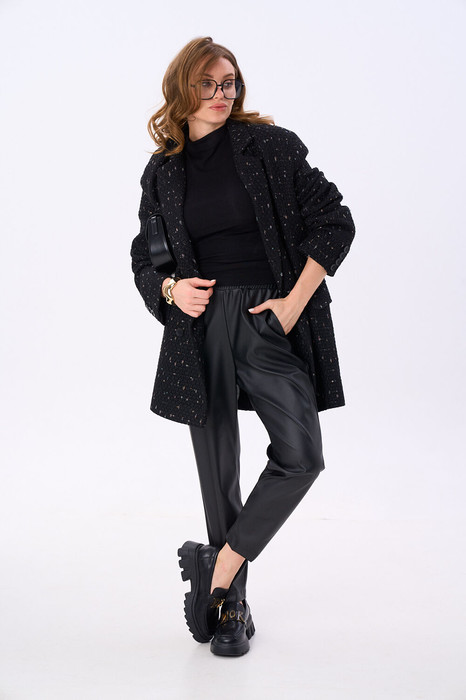 Костюм двухпредметный: состоит из жакета и брюк. Жакет оверсайз прямого силуэта на подкладке. Застежка бортовая на петли и пуговицы. Детали переда с двумя вытачками и с карманами. Карман прорезной с обтачками и клапаном. Карман с наклонным входом, прорезной, с листочкой. Спинка со средним швом. В среднем шве спинки шлица. Рукав втачной, длинный, двухшовный, с открытой шлицей в локтевом шве. Воротник английский с отрезной стойкой. Брюки с притачным поясом и с карманами в боковых швах..