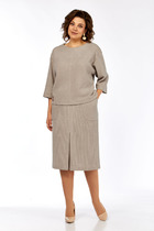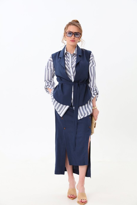 Костюм трёхпредметный: состоит из рубашки, жилета и юбки. Рубашка прямого силуэта  с притачной планкой с застёжкой на петли и пуговицы. Рукав втачной одношовный со спущенной линией плеча  с патой. Воротник  рубашечный стояче-отложной. Перед состоит из трёх частей : центральная часть ,верхняя часть и нижняя часть. Спинка состоит из двух частей . Линия низа фигурная с широкой окантовкой. Жилет съёмный прямого силуэта без застёжки, воротник пиджачного типа. Линия низа фигурная, в комплект идёт пояс из основной ткани. Юбка длиной миди, расклешенная к низу, с асимметричным низом. Пояс притачной, по спинке собран на резинку. Переднее полотнище состоит из трех частей. Правая часть скреплена отделочной строчкой и кнопками. В боковых швах изделия расположены карманы. По спинке изделия идёт средний шов и две вытачки для удачной посадки по фигуре. Юбка без подкладки.