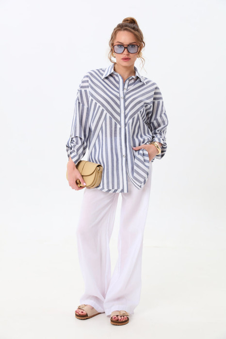 Костюм двухпредметный: состоит из рубашки и брюк. Рубашка прямого силуэта  с притачной планкой с застёжкой на петли и пуговицы. Рукав втачной одношовный со спущенной линией плеча  с патой. Воротник  рубашечный стояче-отложной. Перед состоит из трёх частей : центральная часть ,верхняя часть и нижняя часть. Спинка состоит из двух частей . Линия низа фигурная с широкой окантовкой.  Брюки свободного кроя  сочетают элегантность и комфорт. Широкая резинка на поясе с завязками и наличие функциональных карманов подчеркивают удобство модели.