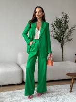 Костюм двухпредметный: состоит из жакета и брюк. Жакет рубашечного типа прямого силуэта с асимметричным низом. Рукав втачной со спущенной линией плеча, фиксируется на пату. Застежка фигурная на петли и пуговицы, смещённая по косой. Воротник рубашечный. Брюки с притачным поясом и с карманами в боковых швах.
