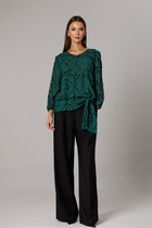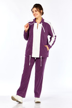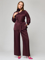 Комплект брючный 2-х предметный, состоящий из блузки и брюк. Блузка полуприлегающего силуэта, выполнена из вискозного полотна. Модель с плечевыми накладками и разрезами в боковых швах. Перед декорирован вставками с застроченными вертикальными защипами и отрезными фигурными планками, застегивающимися на 3 петли и 3 пуговицы. От планок к швам притачивания вставок направлены навесные петли, застегнутые на пуговицы. Спинка со средним швом; круглая горловина спинки обработана отрезной фигурной бейкой. Рукав короткий, втачной. Длина блузки – 66,5 (46-50 р-р) см, 69 см (52-60 р-р); длина рукава – 19,5 см (46-50 р-р), 20,0 (52-60 р-р) см. Брюки классические, с посадкой на талии, выполнены из вискозного полотна. Модель с центральной застёжкой на тесьму-«молнию», на притачном поясе, застегивающемся на петлю и пуговицу. Передние и задние половинки брюк с талиевыми вытачками, направленными от пояса вниз. Спереди обработаны боковые наклонные карманы. Для лучшего прилегания брюк в области талии в поясе по задним половинкам вставлена эластичная лента. Длина брюк по боковому (с поясом) – 101,5 см (46-50 р-р), 102,5 см (52-54 р-р), 103,5 см (56-60 р-р).