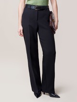 Брюки классические, с посадкой на талии, на притачном поясе с 5-ю шлевками, с застёжкой на тесьму-«молния», расположенную в среднем шве передних половинок, и 1 петлю и 1 пуговицу на поясе. Передние половинки брюк с двумя, застроченными от пояса вниз, односторонними складками, с боковыми наклонными карманами. Задние половинки брюк с талиевыми вытачками, идущими от пояса вниз. Для лучшего прилегания брюк в области талии в поясе по задним половинкам вставлена резинка.