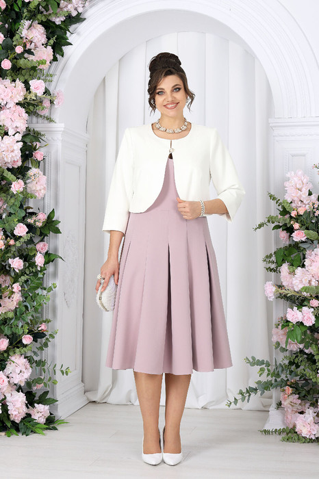 Комплект женский, состоящий из жакета и платья. Укороченный жакет полуприлегающего силуэта на подкладке. Деталь переда с двумя талевыми вытачками и с фигурным подрезом около горловины. Спинка со средним швом и рельефами, выходящими из проймы вниз. Рукава втачные, двухшовные, длиной 48,0 см., с разрезом по локтевому шву. Горловина углубленная, круглая, обтачная. Борта круглые, застежка на навесную петлю-пуговицу. Изделие с плечевыми накладками. Платье полуприлегающего силуэта, отрезное по линии талии. На детали переда рельефы выходят из проймы, проходят через центр груди вниз.  Спинка цельнокроеная, с талевыми выточками. Юбка широкая к низу, с тремя клиньями спереди и сзади.  Посередине каждого клина зашиты встречные складки. В левом боковом шве обработана застежка на потайную тесьму молнию. Рукава втачные, одношовные. Горловина углубленная, обтачная, с вырезом в виде “капельки” посредине переда. Углы выреза скреплены украшением. Пояс отлетной, обтачной, из двух цветов ткани, с перекантом на лицо и с застежкой на петлю-пуговицу сзади.  Изделие с плечевыми накладками.