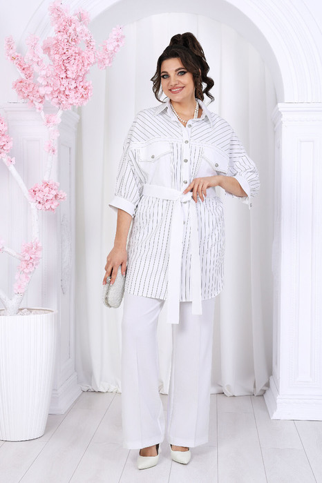 Блузка прямого силуэта, выполнена из ткани «лен-вишер». Модель со спущенной линией плеча, без плечевых накладок, с однобортной внешней застежкой с отрезными планками на 8 петель и 8 пуговиц. В верхней части переда настрочены накладные карманы с фигурным клапаном, входящим в шов притачивания кокетки и застегивающимся на петлю и пуговицу. Низ кокетки оформлен прямой бейкой.  В верхней части спинки – притачная кокетка. Горловина округлой формы со стояче-отложным воротником на отрезной стойке. Рукав длиной 3/4, со сборкой вдоль притачной манжеты, застегивающейся на 1 петлю и 1 пуговицу.  В нижней части боковых швов обработаны разрезы, а на уровне линии талии настрочены шлевки, для фиксации съемного пояса. Отделочные строчки по блузке - контрастного цвета. Длина блузки – 86 см (50-58 р-р); длина рукава (от горловины, с учетом манжеты) – 57 см (50-52 р-р), 58,5 см (54-58 р-р).