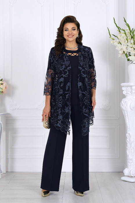 Комплект состоит из трёх предметов: изысканного кардигана из гипюра, мягкой трикотажной блузки и классических брюк со стрелками. Такой ансамбль выглядит нарядно, подчеркивает женственность и формирует правильный силуэт даже для фигур plus size.