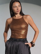 Джемпер полуприлегающего силуэта, выполнен из хлопкового трикотажного полотна. Горловина округлой формы, углубленная спереди. Срезы горловины и пройм окантованы косой бейкой. Длина джемпера -- 61 см.