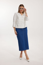Жакет прямого силуэта, выполнен из ткани «лен-вишер». Модель без подкладки, с плечевыми накладками и однобортной внешней застежкой с отрезными планками на 7 петель и 7 пуговиц. Перед с нагрудными вытачками, выходящими из пройм. В нижней части переда настрочены накладные карманы с бантовой складкой посередине кармана и клапаны, застегивающиеся на 1 петлю и 1 пуговицу. По спинке и частично по переду настрочена кулиса, в которую втянут поясок из основной ткани. Для регулировки сборки по кулисе предусмотрены фиксаторы, концы пояса оформлены наконечниками. Горловина округлой формы со стояче-отложным воротником на отрезной стойке. Рукав втачной, длинный, с притачной манжетой, застегивающейся на 1 петлю и 1 пуговицу; по середине рукава настрочена пата, застегивающаяся на 1 петлю и 1 пуговицу, что позволяет регулировать длину рукава. Длина жакета - 71 см (46-50 р-р), 72 см (52-60 р-р), 73 см (62-66 р-р). Длина рукава (с манжетой) - 61 см.
