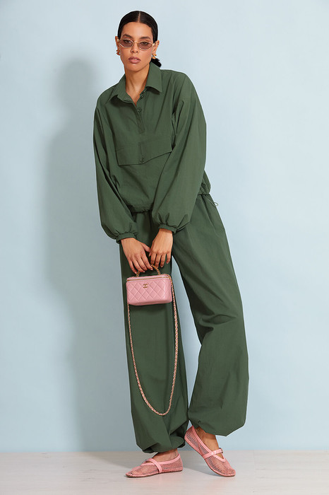 Стильный легкий костюм, состоит из анорака и брюк –“алладинов”. Анорак прямого силуэта без застежки. Перед и спинка изделия прямые. На передней половинке накладной карман-кенгуру с клапаном. Спущенная линия плеча. Свободный объемный рукав. Низ рукава и низ изделия на резинке. По низу изделия дополнительно вставлена “шляпная” резинка, для регулировки изделия по фигуре. Притачная планка и рубашечный воротник со стойкой. Брюки без подкладки. Изделие на поясе, в который вставлена резинка. Спереди имитация застежки. Низ брюк так же на резинке. Карманы в боковых швах.