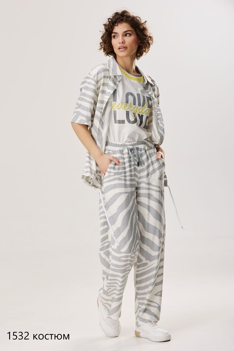 Брюки средней посадки. В пояс вставлена резинка с регулируемым шнурком. В боковых швах карманы.